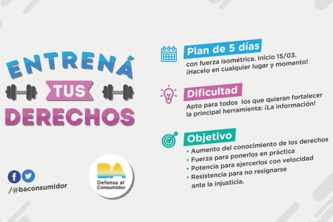 En el marco del Día Mundial de los Derechos del Consumidor, la Ciudad lanza la campaña “Entrená tus derechos”. La rutina, ideada por los especialistas de Defensa al Consumidor porteña, es un plan de acción intensivo que busca guiar a los vecinos en el ejercicio de sus derechos para lograr en solo 5 días consumidores más informados, veloces en la detección de incumplimientos y fuertes para combatir las injusticias.