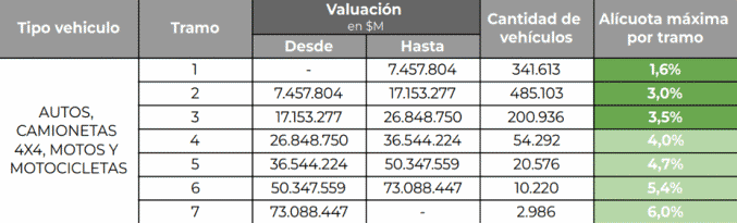 Desde 2025, el impuesto se calcula con escalas y alícuotas ajustadas para mayor equidad y progresividad entre vehículos de valor similar. En 2026, se mantiene este esquema; la alícuota depende del valor del vehículo en octubre de 2025. El 92% de los 1.115.726 vehículos tributan en los tres tramos más bajos, con una alícuota máxima del 3,5%.
