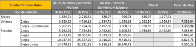 Los nuevos valores del Cuadro Tarifario Único de los peajes en la Ciudad de Buenos Aires quedaron establecidos desde este sábado de la siguiente manera: