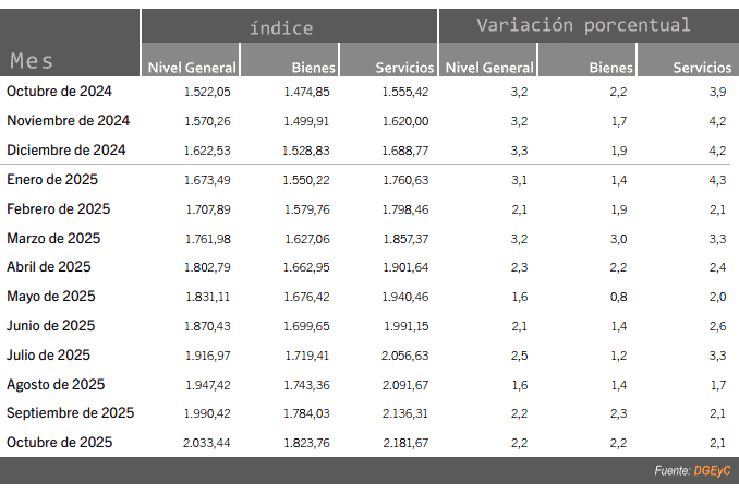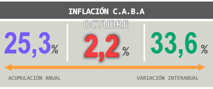 La inflación en la Ciudad de Buenos Aires registró en octubre un aumento de precios promedio de 2,2%, sin variación respecto a septiembre. En los diez meses que lleva el 2025, acumula un 25,3%, en tanto que la trayectoria interanual de este indicador descendió a 33,6%. (-1,4% respecto al mes previo).