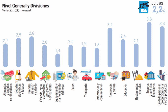 Durante octubre la variación del IPCBA respondió fundamentalmente a las subas en las siguientes divisiones: Vivienda, agua, electricidad, gas y otros combustibles, Transporte, Alimentos y bebidas no alcohólicas, Salud y Recreación y cultura, que en conjunto explicaron el 70,1% del alza del Nivel General.