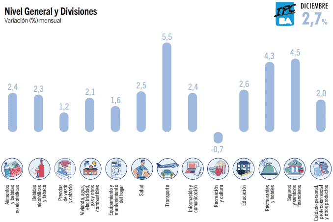 Durante diciembre la variación del IPCBA respondió fundamentalmente a las subas en las siguientes divisiones: Transporte, Restaurantes y hoteles, Alimentos y bebidas no alcohólicas y Vivienda, agua, electricidad, gas y otros combustibles