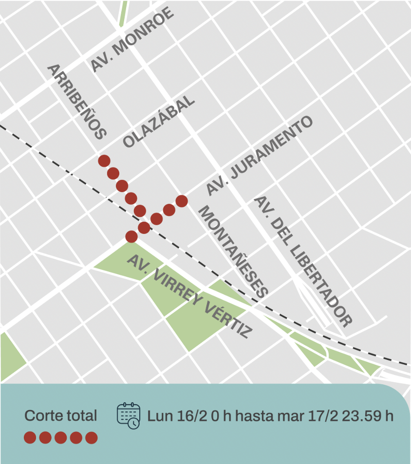 Desde las 0 horas del lunes 16 de febrero hasta las 23.59 del martes 17 de febrero se cortará de forma total la Av. Juramento entre Av. Virrey Vértiz y Montañeses, sin afectar las bocacalles, y la calle Arribeños entre Olazábal y Juramento, sin afectar la bocacalle de Olazábal.