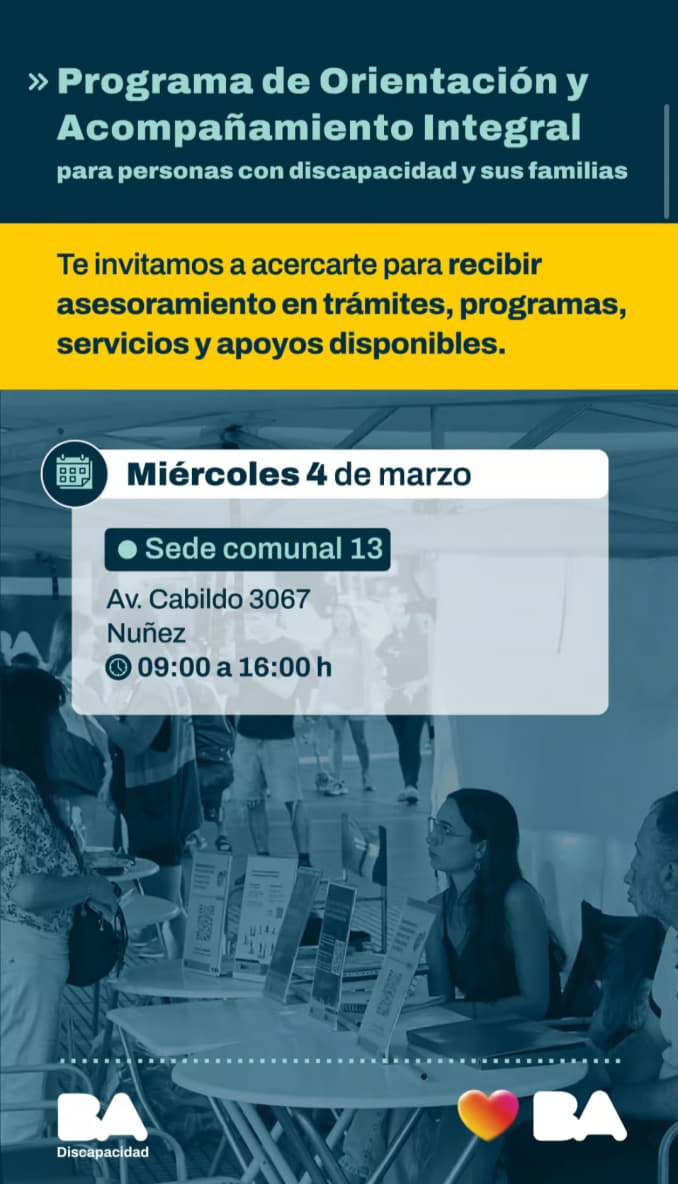 El miércoles 4 de marzo un equipo de BA Discapacidad se hará presente de 9 a 16 horas en la Sede de la Comuna 13 brindando asesoramiento presencial y personalizado para personas con discapacidad y sus familias, facilitando trámites, programas y apoyos en la Ciudad.