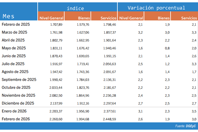 Durante el mes de febrero los Bienes registraron una suba de 1,9% (-0,4%), por debajo de los Servicios que aumentaron 3,0% (-0,5%).