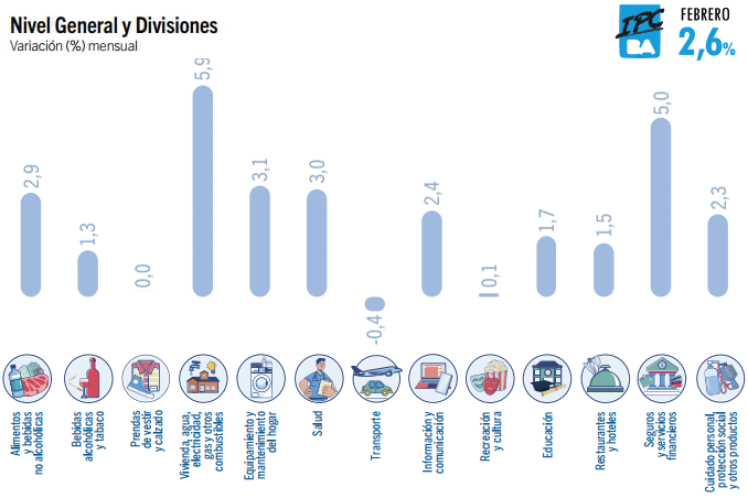 La variación del IPCBA de febrero respondió fundamentalmente a las subas en las siguientes divisiones: Vivienda, agua, electricidad, gas y otros combustibles, Alimentos y bebidas no alcohólicas, Salud, Restaurantes y hoteles e Información y comunicación.