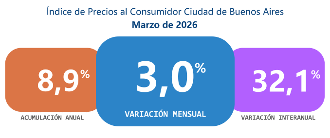 Durante marzo, la inflación en la Ciudad registró una suba de 3% y retomó la senda alcista tras el leve descenso de febrero (2,6%), así, en el primer trimestre de 2026 alcanza un incremento de 8,9%, en tanto que la trayectoria interanual se ubicó en 32,1%, 0,3% por debajo del mes previo.