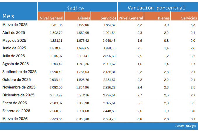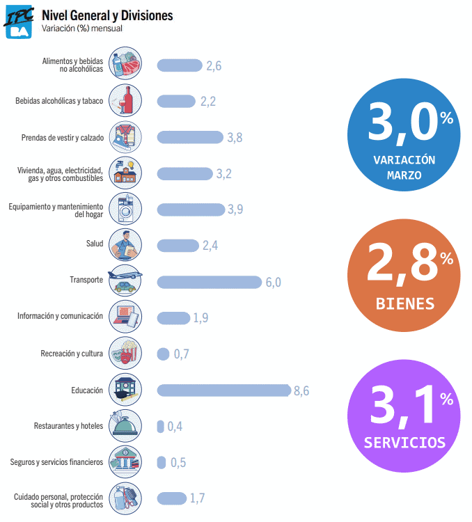 La Dirección General de Estadísticas y Censos porteña informó un incremento del 3% promedio de los precios en la Ciudad durante marzo y acumula 8,9% en el transcurso de 2026.